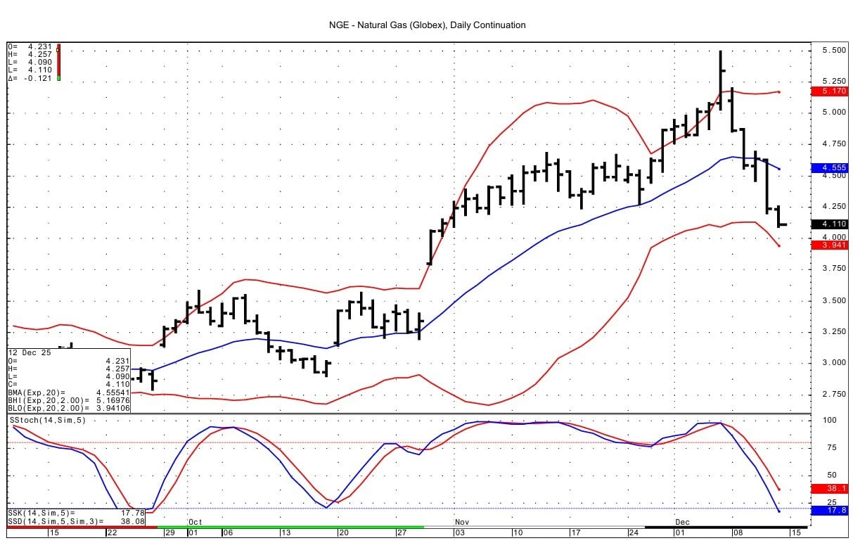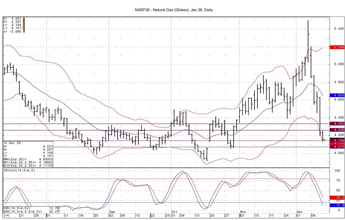 Technically Thursday's settlement price saw NG spot futures having fallen by 20.0% from the high settlement seen last Friday. The NG January daily chart has a mean reversion setup from Thursday's settlement below the lower bollinger band. Support for the spot NG futures at 4.131-4.140 has been broken. Next best support seen lies at 4.070-4.073. Resistance comes in at the overnight high at 4.257-4.259. Momentum is negative for the NG.