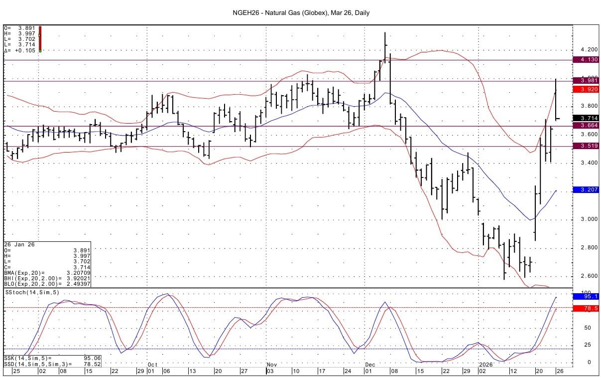 Technically the gap in the March NG futures goes down to $3.664. The March contract tested the daily chart upper bollinger band overnight; that band lies at $3.92. Support for the March NG comes in at 3.509-3.519. Resistance is seen at 3.981-3.985, which was tested with the overnight high of 3.997. Above that resistance lies at 4.130.