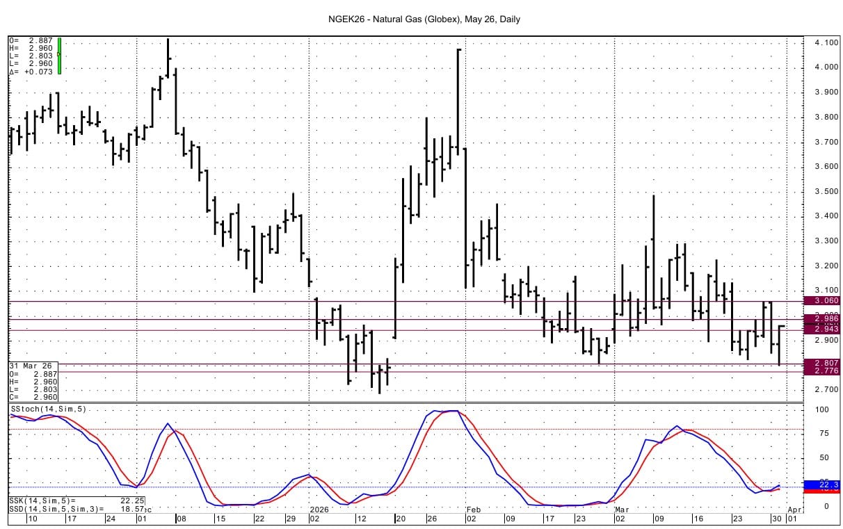 Technically, momentum has turned positive for the NG basis both the DC and May daily charts with this morning's rally. The overnight selloff tested support at $2.807 with a low of $2.803. The DC chart's lower bollinger band was also tested; that band intersects at $2.835. Below $2.80, support lies at 2.776. Resistance at 2.943 has been pierced. Above that resistance is seen at 2.981-2.986 and then at the double top from Friday/Monday at 3.057-3.060.