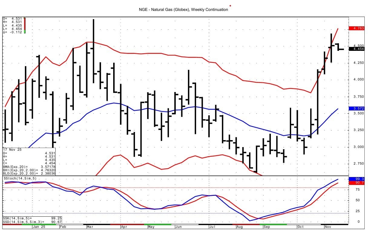 Technically the weekly NG continuation chart shows a mean reversion setup as the contract settled Friday over the upper bollinger band. That band lies currently at $4.76. Also, the stochastic momentum indicator basis the weekly chart is getting overbought. The DC chart shows momentum trying to turn downward from an overbought condition; yet, the spot futures are currently having an inside trading day versus Friday's price range.