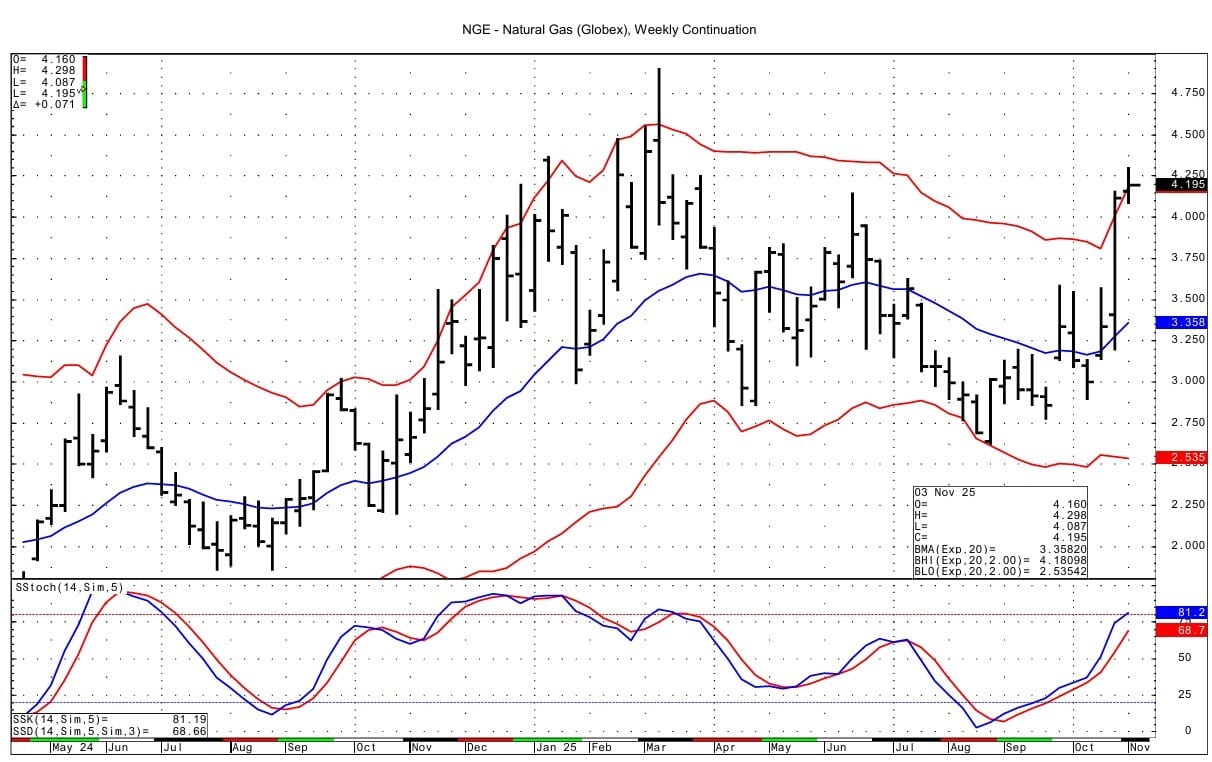 Technically, NG spot futures have again tested the upper bollinger band on the DC chart in today's session and have also tested the weekly chart's upper bollinger band. Reuters commentary from Friday re NG futures said that the contract was "technically overbought territory for a second day in a row for the first time in four weeks." They added :" For the week, the front-month was up about 25% after gaining 10% last week. That 25% gain would be its biggest weekly percentage gain since the contract rose by a record weekly percentage gain of around 33% in April 2024."