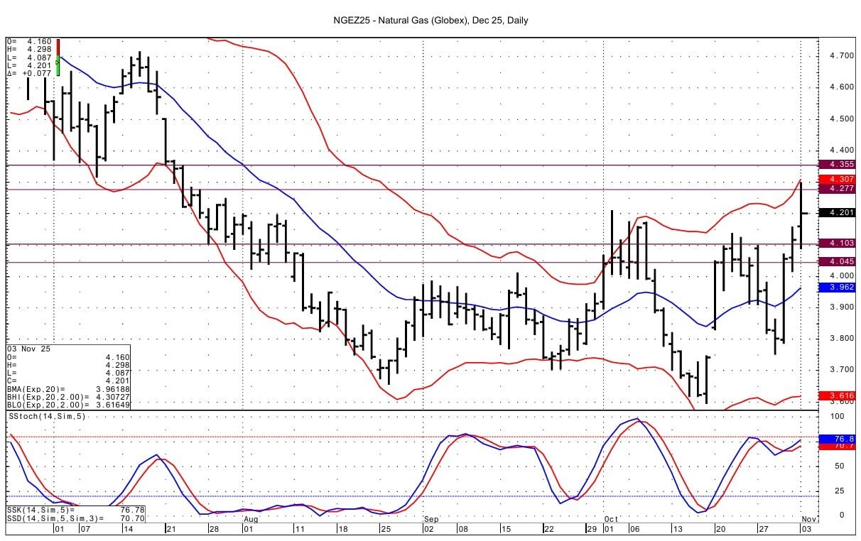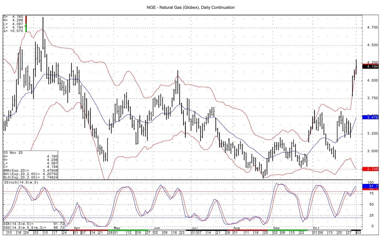The DC chart upper bollinger intersects at 4.208 .The weekly upper bollinger band intersects at 4.180. Momentum basis both the DC and Weekly charts is positive and not yet overbought, though looks like it will be so in a day or 2 on the DC chart. Resistance for the spot futures comes in at 4.277-4.284, which was tested with the overnight high of 4.298. Above that resistance lies at 4.355.Support is seen at 4.103-4.109 and then at 4.045-4.046. The overnight low is 4.087.