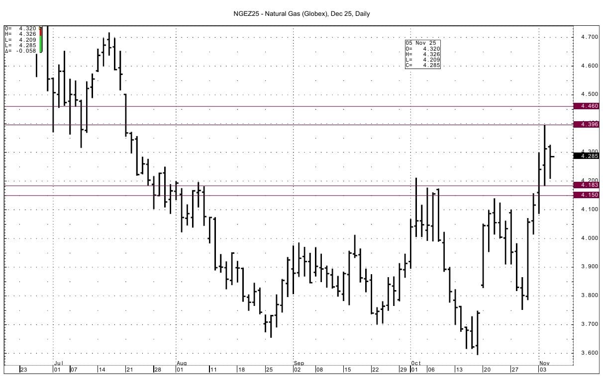 The LN/ NG options on the CME saw dramatic open interest increases. The December call options open interest on the CME rose by 35,478 contracts, while that for the December puts rose by 33,599 contracts, even as the $3.00 put strike saw open interest fall by 9,441 contracts. In the December options, the $3.75/$3.50 put spread traded 3 cents in size. Among the December calls, the $4.50/$5.00 call spread traded 11.75 cents with delta futures sales at $4.35 and also traded 12.0 cents with delta futures sold at $4.37. Also there were large trades seen in the March April one month 25/50 cent call spread option. The spread traded 3.3 and 3.5 cents. Additionally, the 25 cent call in the March April CSO traded 14.4 cents on its own. Also, notably, the February $11/$14 call spread traded in some size at prices of 1.3 to 1.7 cents. CME open interest data has this as an opening position.
