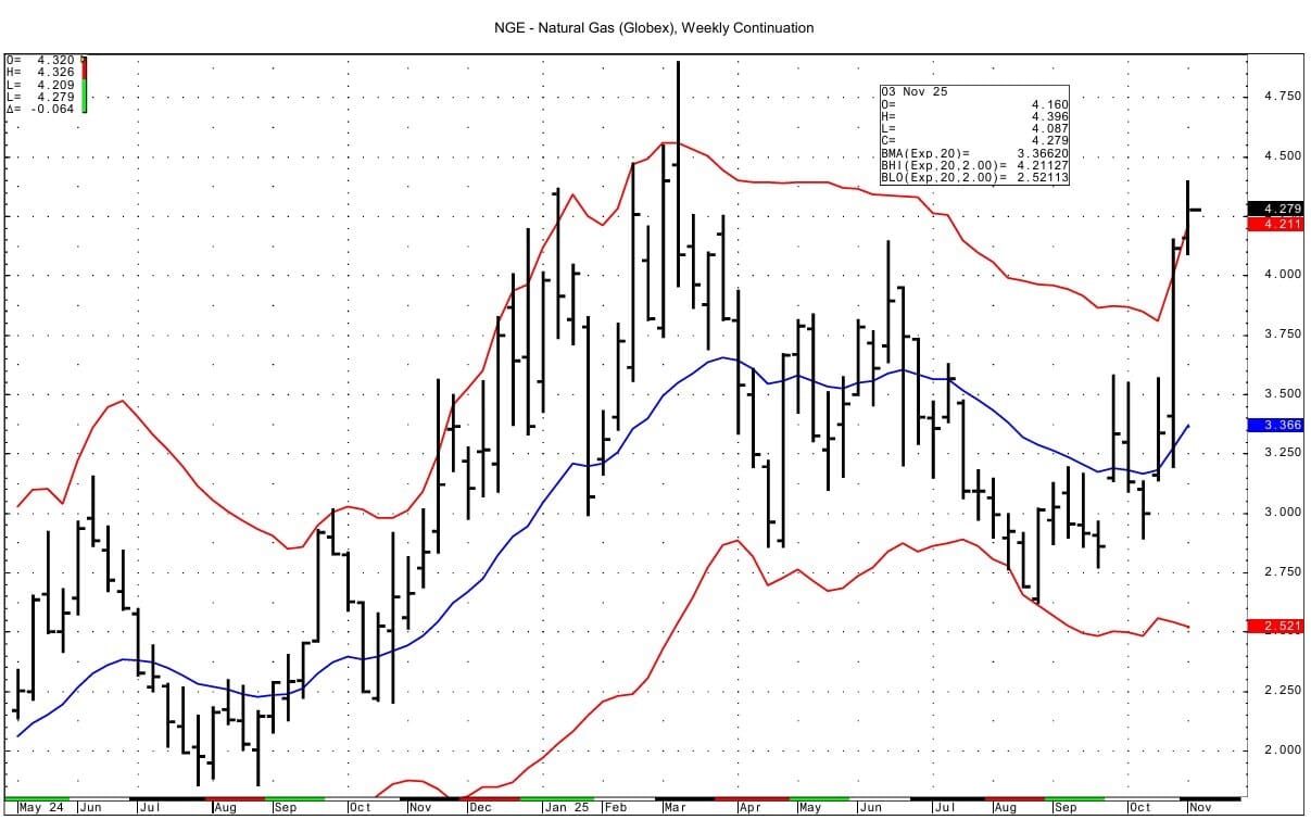 The NG spot futures continue to test the weekly continuation chart upper bollinger band that intersects at $4.210. Technically the DC chart based momentum is getting overbought for NG spot futures. Resistance lies at yesterday's high at 4.396 and then at 4.456-4.463. Support lies at 4.180-4.183 and then at 4.148-4.157.